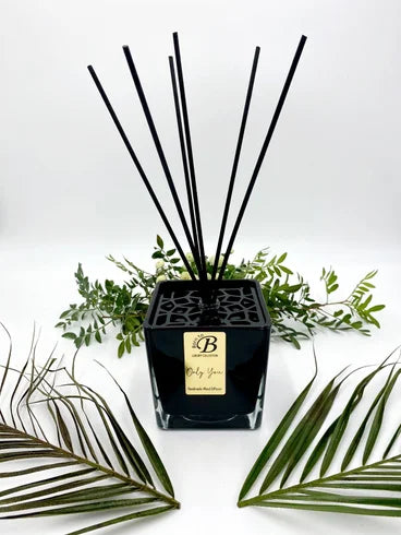 Verstuivers met Grasse geuren. Elke stick diffuser wordt gepresenteerd in een witte glazen container met daarop een dubbele acryl cover, ontworpen en gesneden door ons. Het gaat vergezeld van witte rotan stokjes en een geschenkdoos met een stempel van bladgoud.